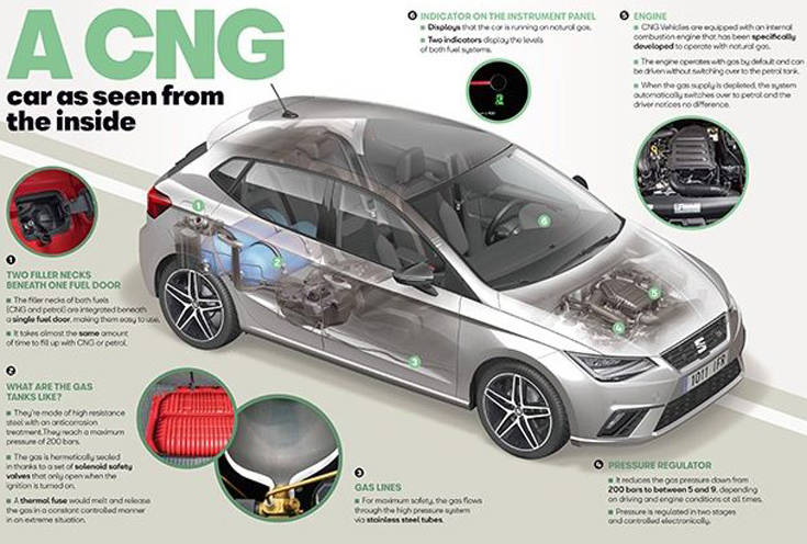 Τα αυτοκίνητα CNG είναι εξοπλισμένα με τελευταίας τεχνολογίας κινητήρα εσωτερικής καύσης, που λειτουργεί με συμπιεσμένο φυσικό αέριο ή βενζίνη. Ο οδηγός δεν αντιλαμβάνεται πότε πραγματοποιείται η αλλαγή αυτή, καθώς η απόδοση του κινητήρα είναι ακριβώς η ίδια και με τους δύο τύπους καυσίμου. Ο κινητήρας διαθέτει πολλά ειδικά ενισχυμένα εξαρτήματα για την καύση του φυσικού αερίου. Συμμορφώνεται με τους πιο αυστηρούς κανονισμούς σχετικά με τις εκπομπές και η επικέτα ECO της Γενικής Διεύθυνσης Κυκλοφορίας για τα αυτοκίνητα που τροφοδοτούνται με φυσικό αέριο το αποδεικνύει.