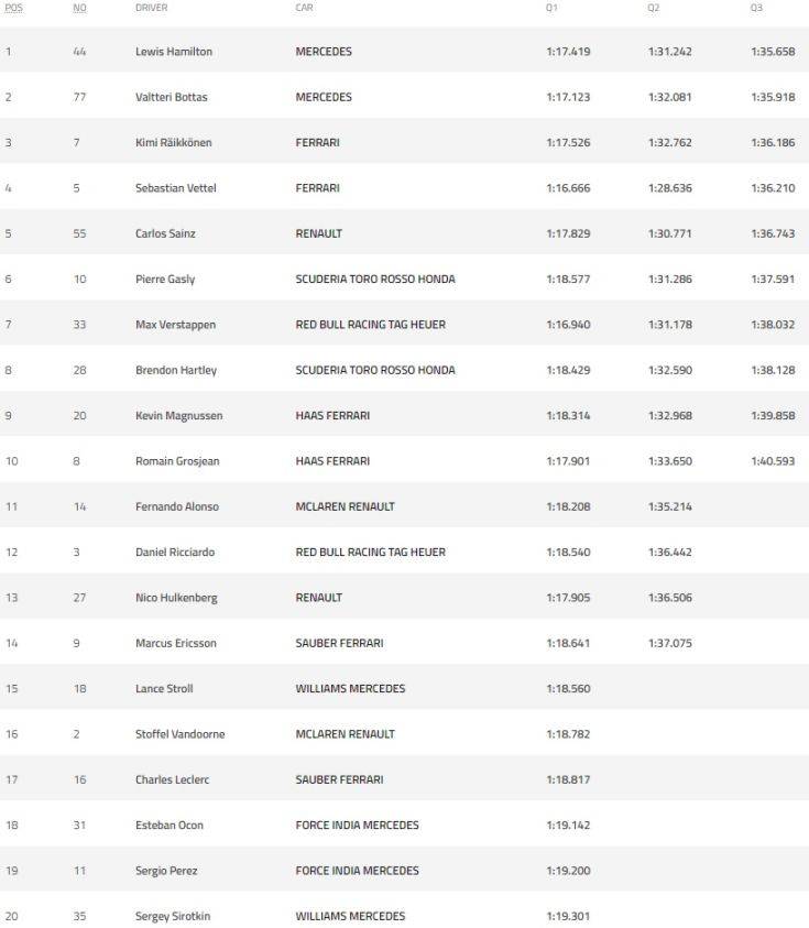 Πολλές ανατροπές είχαμε στις σημερινές κατατακτήριες δοκιμές στην Ουγγαρία. Αρχικά, η πίστα ήταν λίγο βρεγμένη, οι οδηγοί βγήκαν με ενδιάμεσα ελαστικά. Ύστερα από λίγα λεπτά, η άσφαλτος ήταν εντελώς στεγνή, τα ενδιάμεσα ανέβαζαν θερμοκρασία και έτσι, μπήκαν όλοι να βάλουν φρέσκα ultrasoft! Οι χρόνοι άρχισαν να κατεβαίνουν και όλα έδειχναν πως θα πάνε ομαλά. Η βροχή όμως δεν είχε φύγει οριστικά και επέστρεψε. Αυτή τη φορά όχι ως ψιχάλα αλλά ως… κατακλυσμός, φέρνοντας πάρα πολύ νερό στην πίστα! Κάποιοι είχαν μπει από πιο νωρίς και είχαν βάλει τα ενδιάμεσα ξανά, όμως στη συνέχεια είδαν πως ούτε αυτά επαρκούσαν και ξαναμπήκαν για τα βρόχινα. Αυτό έγινε στη μέση του Q2 και οι οδηγοί που δεν πρόλαβαν να κάνουν έναν καλό γύρο με τα ενδιάμεσα, θα ήταν αδύνατο να περάσουν κάποιον με τα βρόχινα. Έτσι πολλοί δεν κατάφεραν να μπουν καν στο Q3, όπως ο Ντάνιελ Ρικιάρντο για παράδειγμα! Στη συνέχεια, περνώντας στο Q3, οι δύο Ferrari έδειχναν σαν να μην μπορούν να βρουν καλό ρυθμό στο νερό. Ο Κίμι Ράικονεν έκανε την έκπληξη και πέρασε πρώτος, λίγα λεπτά πριν το τέλος της διαδικασίας, όμως ο Λιούις Χάμιλτον τον πέρασε και πήρε τελικά εκείνος την pole position, επιβεβαιώνοντας όσους λένε ότι είναι… βασιλιάς στις βρεγμένες πίστες! Ο Βαλτέρι Μπότας τα πήγε επίσης πολύ καλά, δίνοντας το 1-2 στην Mercedes για την αυριανή εκκίνηση, ενώ στην τρίτη και την τέταρτη θέση, οι Ράικονεν, Φέτελ. Πέμπτος ο Σάινθ. Γκασλί, Φερστάπεν, Χάρτλεϊ, Μάγκνουσεν και Γκροζάν η τελική σειρά του Q3. Δείτε αναλυτικά τα αποτελέσματα των κατατακτηρίων δοκιμών: