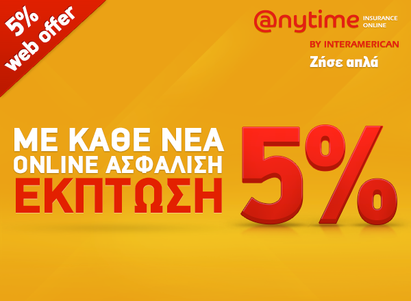 Τώρα η Anytime, η πρώτη direct ασφάλιση από την Interamerican, σας προσφέρει 5% έκπτωση στα ασφάλιστρα, σε κάθε online ασφάλιση αυτοκινήτου. Η προσφορά αυτή ισχύει όχι μόνο για την πρώτη φορά που ασφαλίζετε το αυτοκίνητό σας, αλλά και σε κάθε ανανέωση του συμβολαίου σας.