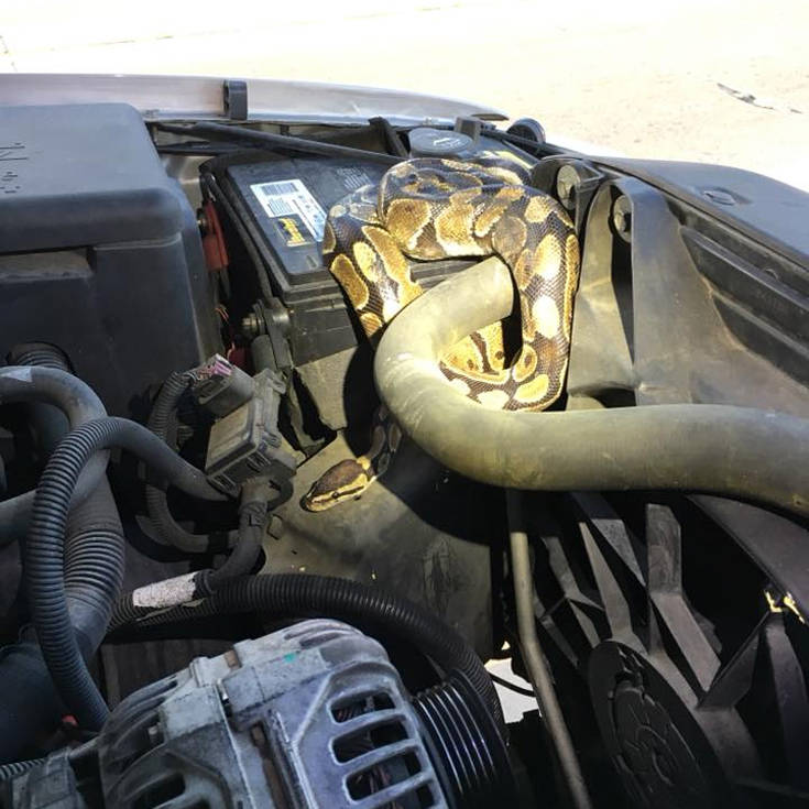 Ανοίγοντας το καπό ωστόσο την περίμενε μια τρομακτική έκπληξη. Ένας βασιλικός πύθωνας είχε εισβάλλει στο διαμέρισμα του κινητήρα προκαλώντας προβλήματα στη λειτουργία του μοτέρ καθώς εμπόδιζε τον ιμάντα χρονισμού.