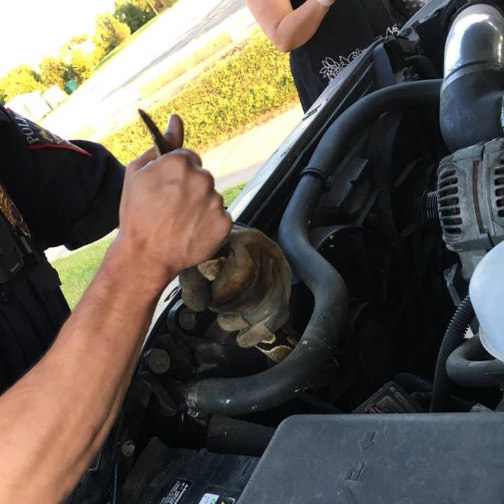 Έντρομη η γυναίκα κάλεσε την αστυνομία και ενημέρωσε για το περιστατικό. Στο σημείο έσπευσε ένα περιπολικό με δύο αξιωματικούς που όσο κι αν προσπάθησαν δεν κατάφεραν να απομακρύνουν το φίδι από τον κινητήρα. Έτσι κάλεσαν τον ειδικό σε ό,τι έχει να κάνει με ερπετά, Στιβ Κέλερ ο οποίος έδωσε λύση στο πρόβλημα.