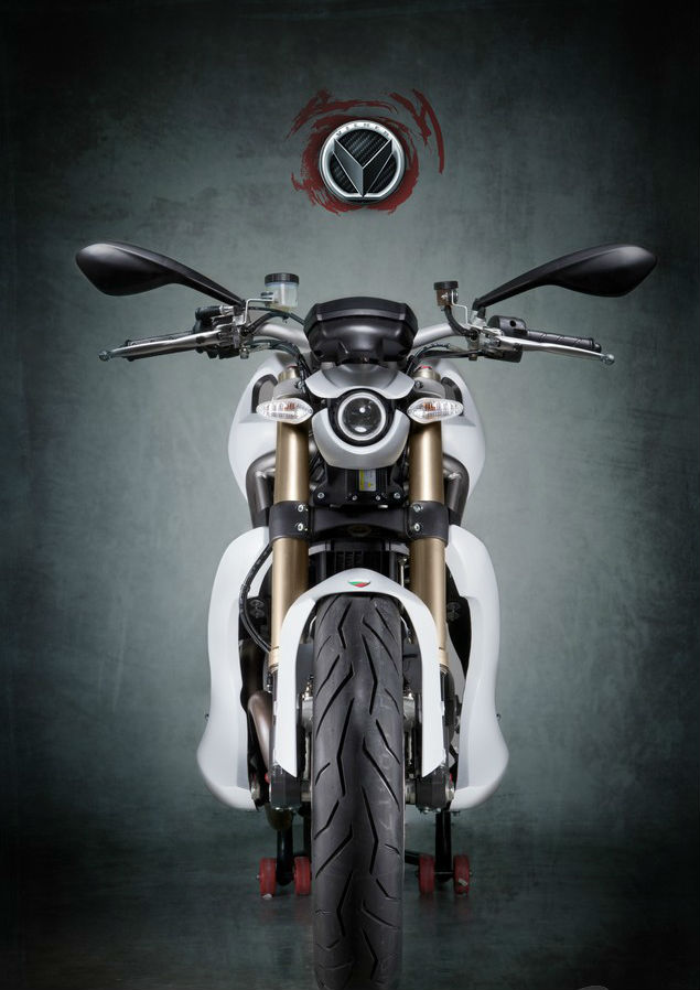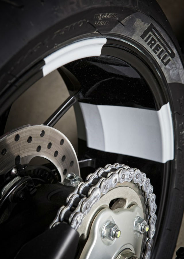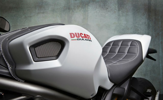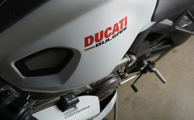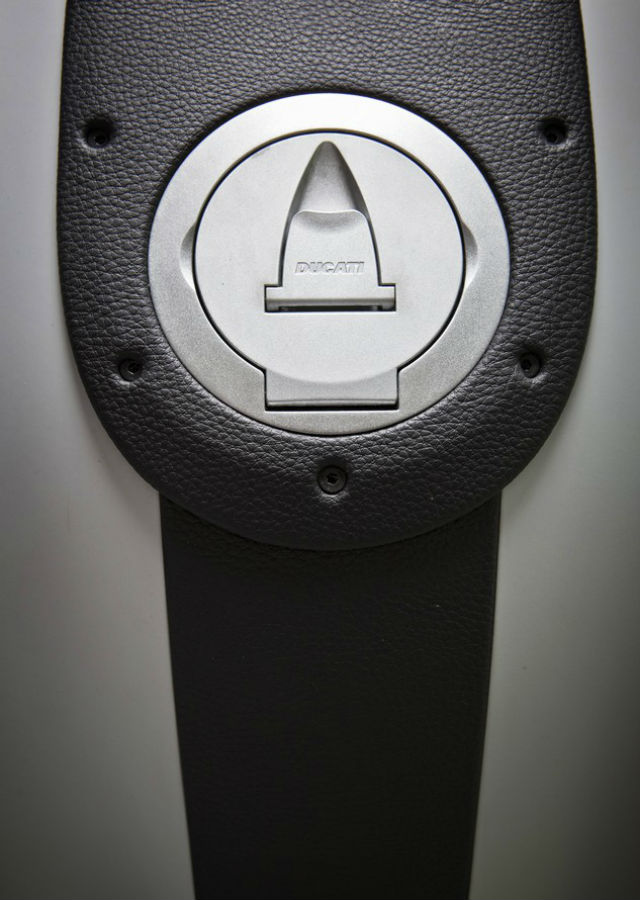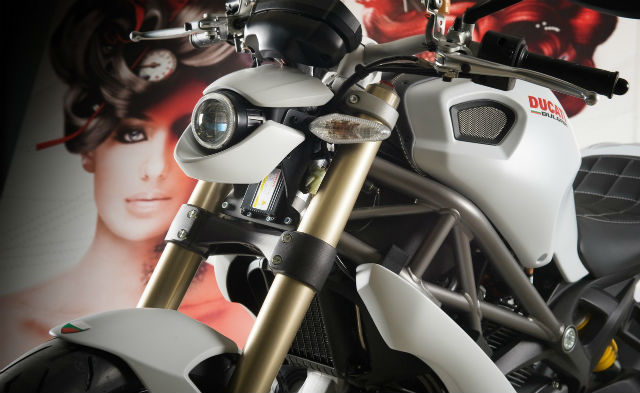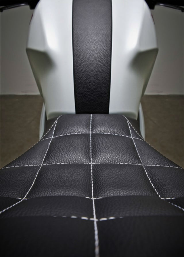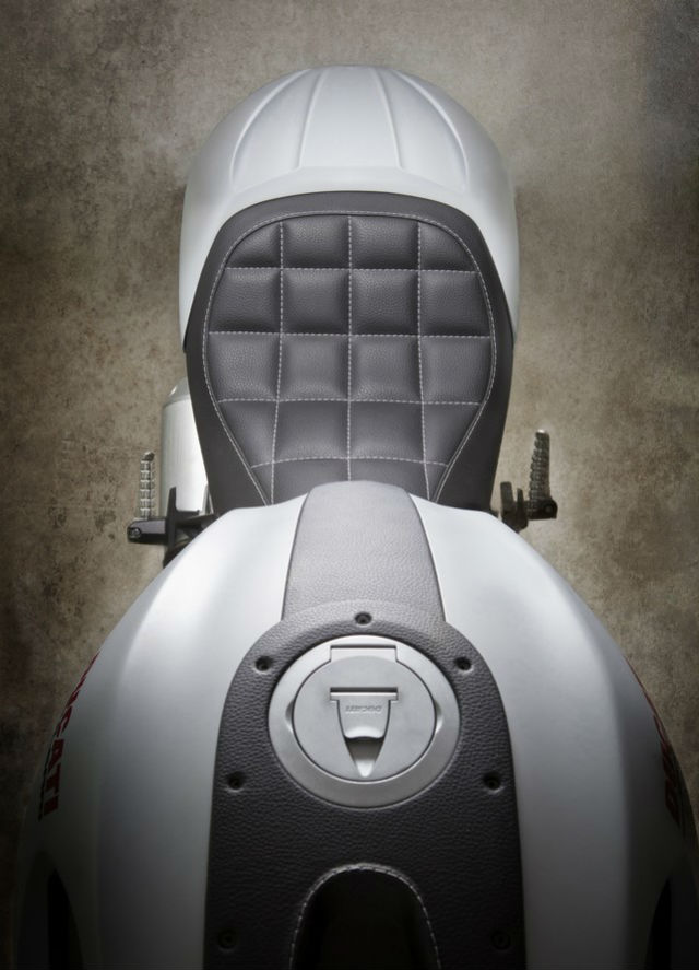 Αξίζει να αναφέρουμε την εξαιρετική δουλειά στη σέλα και το υπερμοντέρνο εμπρός φωτιστικό καθώς και την αστραφτερή μαργαριταρένια λευκή βαφή, διαφορετική από αυτήν που χρησιμοποιεί η ίδια η Ducati.