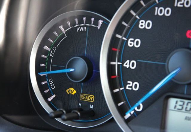 Στο εσωτερικό, οι αλλαγές έχουν να κάνουν με τη διαμόρφωση της κατάλληλης ατμόσφαιρας. Παρακάτω διακρίνεται το μπλε φόντο του πίνακα οργάνων, με τα χαρακτηριστικά δαχτυλίδια και τους μπλε δείκτες στα όργανα, το μπλε τελείωμα στο λεβιέ ταχυτήτων, που θυμίζει την ύπαρξη του E-CVT κιβωτίου, αλλά και την εξτρά λειτουργία στο Toyota Touch & Go σύστημα infotainment που απεικονίζει τη λειτουργία, σε real time, του υβριδικού συστήματος.