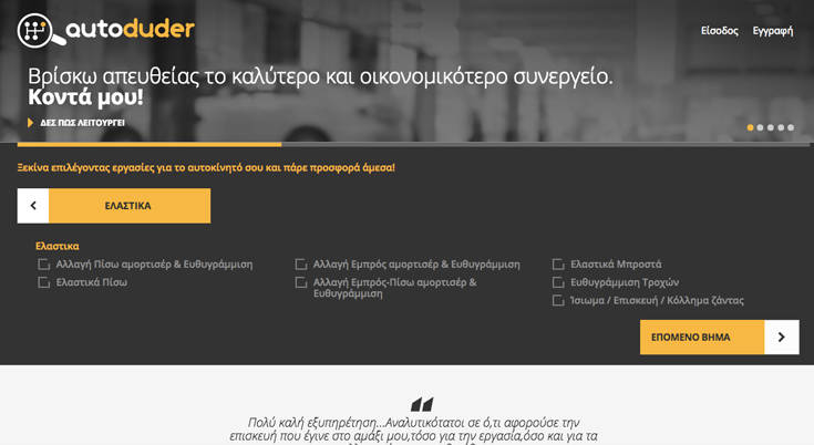 Μετά από έξι μήνες λειτουργίας όπου καθιερώθηκε ως η πρώτη επιτυχημένη online πλατφόρμα σύγκρισης ΙΧ συνεργείων στην Αττική, ο autoduder πατάει και άλλο το γκάζι στην εξυπηρέτηση και προσθέτει στις εργασίες του και τα ελαστικά αυτοκινήτων την πιο κατάλληλη εποχή. Η δημοφιλής πλατφόρμα δίνει πλέον στους χρήστες την ευκαιρία να συγκρίνουν τιμές και αξιολογήσεις και να βρουν το πιο κοντινό συνεργείο της αρεσκείας τους για εργασίες που καλύπτουν συνολικά το service, τα ελαστικά και τις αναρτήσεις. Μέσα από το site ο χρήστης μπορεί να επιλέξει ελαστικά σε όλες τις διαστάσεις για premium μάρκες όπως Pirelli, Michelin, Goodyear, Continental, Dunlop & Bridgestone αλλά και για άλλες 30+ quality ή economy μάρκες ελαστικών. Οι αναγραφόμενες τιμές περιλαμβάνουν πάντα τοποθέτηση και ζυγοστάθμιση τροχών ενώ εκτός από αλλαγή ελαστικών, προσφέρονται και εργασίες για ευθυγράμμιση τροχών, βάψιμο, ίσιωμα ή επισκευή ζάντας για πάνω για πάνω από 12.000 μοντέλα αυτοκινήτων.