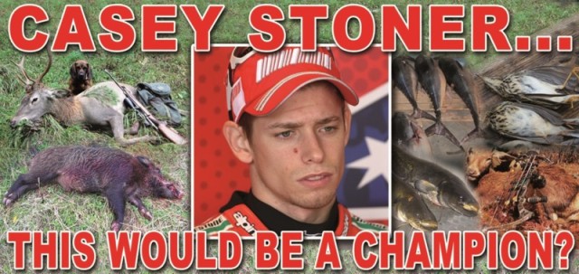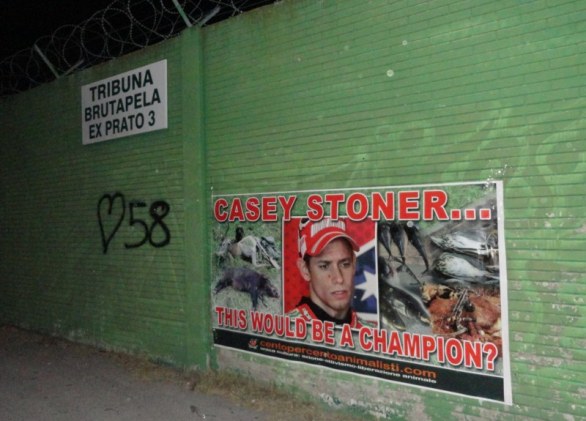 Ξέρουμε ότι ειδικά στην Ιταλία ο Casey Stoner είναι ελάχιστα δημοφιλής, λόγω του «μη σεβασμού» που έχει δείξει πολλές φορές προς τον «ημίθεο» Rossi. Έτσι λίγο θα του κοστίσει η νέα επίθεση που δέχεται στη γείτονα, αυτή τη φορά όχι από τιφόζι της μοτοσυκλέτας αλλά από Ιταλούς υπερμάχους των δικαιωμάτων των ζώων.