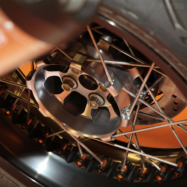 Άλλες αλλαγές περιλαμβάνουν το ομορφότερο τμήμα της μοτοσυκλέτας πλέον που δεν είναι άλλο από τους τροχούς – κοσμήματα της Kineo. Ελαφρύτερες, αλουμινίου και με ακτίνες, δίνουν το χαρακτήρα του motard που επιθυμούσαν οι βελτιωτές. Μπορούν να υποδεχτούν ελαστικά tubeless, χωρίς αεροθάλαμο δηλαδή που πάει συνήθως συνοδεύει (ως αναγκαίο κακό) τις ζάντες με ακτίνες.