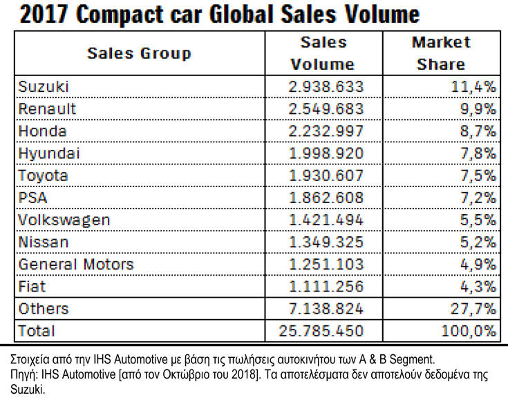 Η Suzuki ανακηρύχθηκε ξανά ως η πιο αγαπημένη μάρκα compact αυτοκινήτων στον κόσμο βάσει του συνολικού όγκου πωλήσεων μικρών compact αυτοκινήτων για το 2017, σύμφωνα με τα στοιχεία που ανακοίνωσε η IHS Automotive μια εκ των κορυφαίων εταιρειών έρευνών αγοράς. Η Suzuki, μια σχετικά μικρή αυτοκινητοβιομηχανία, είναι συνώνυμο με την αξιοπιστία και την απόλαυση. Προσφέρει αίσθηση ελευθερίας για οδήγηση σε κάθε είδους επιφάνεια και διαθέτει τα μεγαλύτερα ποσοστά πιστότητας των πελατών που την επιλέγουν.