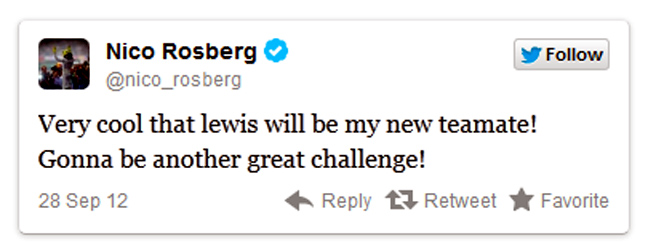 «Είναι πολύ ωραίο που ο Λιούις θα είναι ο νέος μου ομόσταβλος! Πρόκειται να είναι μια ακόμη σπουδαία πρόκληση», έγραψε στο Twitter ο Νίκο Ρόσμπεργκ μετά την ανακοίνωση της Mercedes.