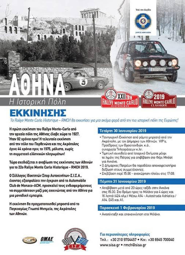 Μετά από μία μακρά παύση 44 ετών η χώρα μας ξαναμπαίνει στο χάρτη των εκδηλώσεων του Automobile Club de Monaco και ένα ακόμα Rallye Monte-Carlo θα επανεκκινήσει από την Αθήνα την Τετάρτη 30/01/2019 στις 12:40, κάτω από την σκιά της Ακρόπολης.