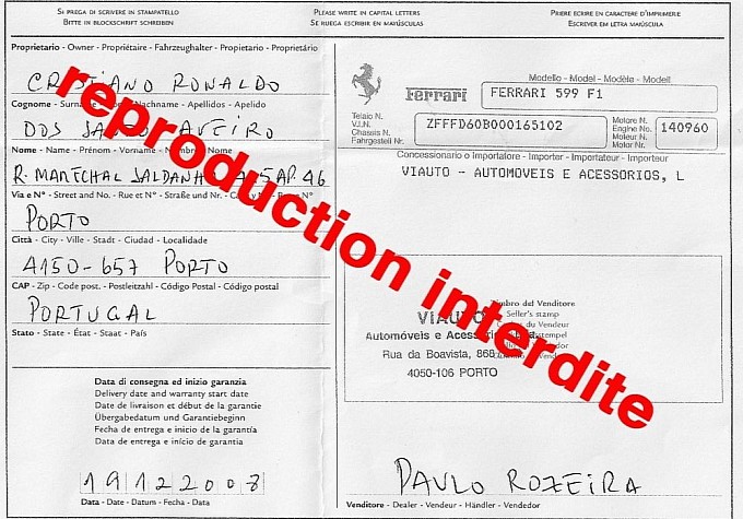 Το 2009,ο Κριστιάνο έπαιζε για τη Μάντσεστερ Γιουνάιτεντ και συνήθιζε να οδηγεί μια Ferrari 599 GTB Fiorano F1. Η τύχη του υπεραυτοκινήτου δεν ήταν καλή, μιας και κατέληξε στα πλάγια ενός τουνέλ.