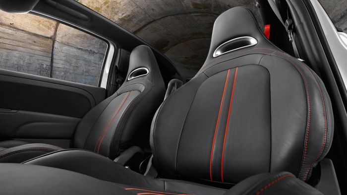 Οι πινελιές της Abarth είναι αισθητές και στο εσωτερικό, με το επίπεδο αγωνιστικό τιμόνι, τα αλουμινένια πεντάλς και τον επίσης αλουμινένιο λεβιέ ταχυτήτων, καθώς και τα νέα σπορ καθίσματα, με τις κόκκινες ραφές, σήμα κατατεθέν του ιταλικού οίκου. Οι πελάτες μπορούν επίσης να παραγγείλουν ένα σύστημα πλοήγησης και ένα Beats Audio σύστημα με έξι ηχεία, ένα 8-ιντσών subwoofer και οκτακάναλο ενισχυτή.