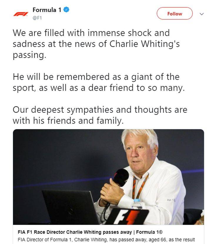 Ο εκτελεστικός διευθυντής του πρωταθλήματος, Τσάρλι Γουίτινγκ, έφυγε σήμερα από τη ζωή, στην Αυστραλία, όπου και βρισκόταν για το εναρκτήριο γκραν πρι. Ο Βρετανός υπέστη πνευμονική εμβολή, κατά την παρουσία του στη Μελβούρνη και άφησε την τελευταία του πνοή σε ηλικία 66 ετών.