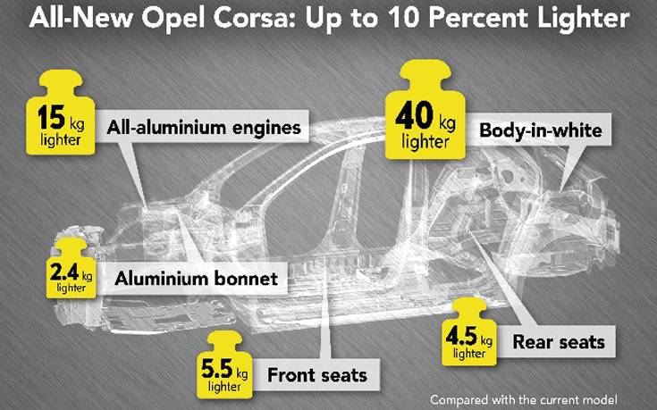 Η σχεδίαση χαμηλού βάρους ξεκινά από τον υπολογιστή και εξελίσσεται με τη συμβολή των πιο σύγχρονων τεχνολογιών εικονικής πραγματικότητας. Χρησιμοποιώντας ατσάλι διαφόρων κατηγοριών και εφαρμόζοντας συγκεκριμένες μεθόδους συγκόλλησης, οι ειδικοί κατάφεραν να μειώσουν αισθητά το βάρος του Corsa. Στην όλη διαδικασία περιλαμβάνεται η συστηματική χρήση κραμάτων υψηλής και υπερυψηλής αντοχής, και η βελτιστοποίηση διαδρομών απόσβεσης φορτίου, συνδέσεων, δομής και μορφής. Συγκριτικά με το προηγούμενο μοντέλο, το σασί αμέσως μετά τη συναρμολόγησή του (body-in-white) είναι 40 κιλά ελαφρύτερο. Το επόμενο Corsa βασίζεται στη νέα πολύ-ενεργειακή πλατφόρμα (multi-energy) για μικρά και συμπαγή μοντέλα, που υποστηρίζει τη λειτουργία ποικίλων συστημάτων κίνησης. Οι πελάτες μπορούν να επιλέξουν είτε κινητήρες καύσης είτε μία πλήρως ηλεκτρική έκδοση.