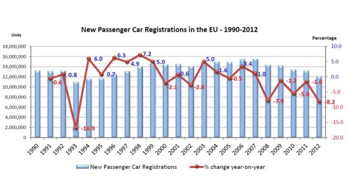 Με πτώση 10% στις Ευρωπαϊκές πωλήσεις για το 2012, η κατάσταση διαμορφώνεται στα χαμηλότερα επίπεδα των τελευταίων δεκαεννέα χρόνων. Η ύφεση αρχίζει να δείχνει ότι δεν είναι απλά συγκυριακή και η πτώση των αγορών στις χώρες του Νότου πλέον ακολουθείται και από αυτές που αποτελούν τον πυρήνα της αυτοκινητοβιομηχανίας.