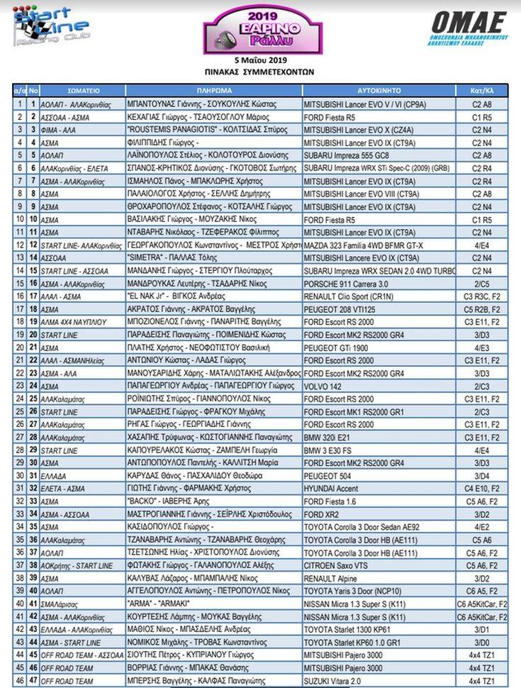 Το Εαρινό Ράλι αναμένεται συγκλονιστικό, με τις ποιοτικές συμμετοχές σε όλες τις κατηγορίες να υπόσχονται έντονο συναγωνισμό και συγκλονιστικές μάχες με το χρονόμετρο. Οι πολύ όμορφες διαδρομές της ευρύτερης περιοχής θα υποδεχτούν τους αγωνιζόμενους και το πλήθος κόσμου που θα βρεθεί στις ειδικές διαδρομές χαρίζοντας μοναδικό θέαμα, θυμίζοντας σε όλους γιατί αποτέλεσαν σημείο αναφοράς για τον Μηχανοκίνητο Αθλητισμό της περιοχής.