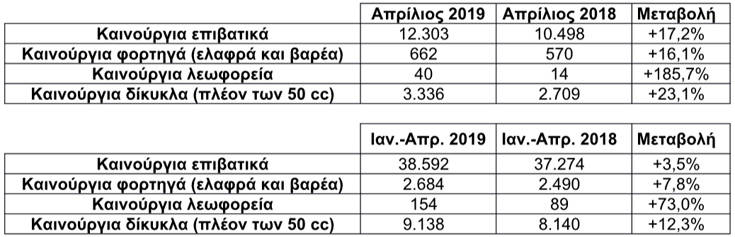 Συνολικά, στο τετράμηνο Ιανουαρίου-Απριλίου 2019, οι ταξινομήσεις καινούργιων επιβατικών είναι αυξημένες κατά +3,5% ως προς το αντίστοιχο διάστημα του 2018.