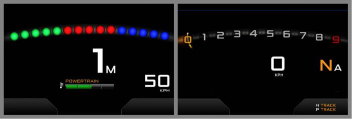 Για παράδειγμα στην επιθετική ρύθμιση «Race» ο πίνακας θα μεταμορφώνεται σε F1 look με ενδείξεις αλλαγής ταχύτητας με πράσινη, κόκκινη και μπλε περιοχή (led ενδείξεις).