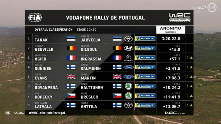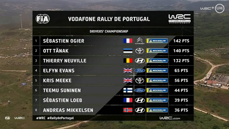 Από την άλλη, ο Οζιέ κερδίζοντας και τους 5 βαθμούς της power stage παραμένει πρώτος στον πίνακα οδηγών του WRC, 2 βαθμούς εμπρός από τον Τάνακ (τρίτος στην p.s.) και 10 εμπρός από τον Νεβίλ (δεύτερος στην p.s.).