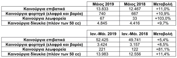 Συνολικά, στο πεντάμηνο Ιανουαρίου-Μαΐου 2019 οι ταξινομήσεις καινούργιων επιβατικών είναι αυξημένες κατά +5,4% ως προς το αντίστοιχο διάστημα του 2018.