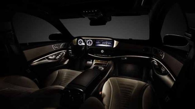 Στο εσωτερικό της νέας S-Class θα ξεχωρίζει το δερμάτινο/ξύλινο τιμόνι, ο κρυφός φωτισμός LED, η πανοραμική οροφή, τα φωτιζόμενα μαρσπιέ και οι πόρτες με το αυτόματο κλείσιμο.