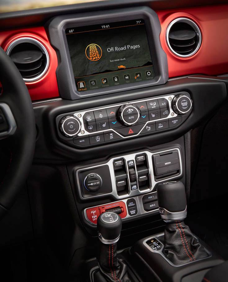 - Σύστημα Rock-Trac 4×4 με επιλογή «4LO» και σχέση μετάδοσης 4:1, καθώς και εμπρός και πίσω διαφορικά με επιλογή κλειδώματος στην έκδοση Rubicon.
