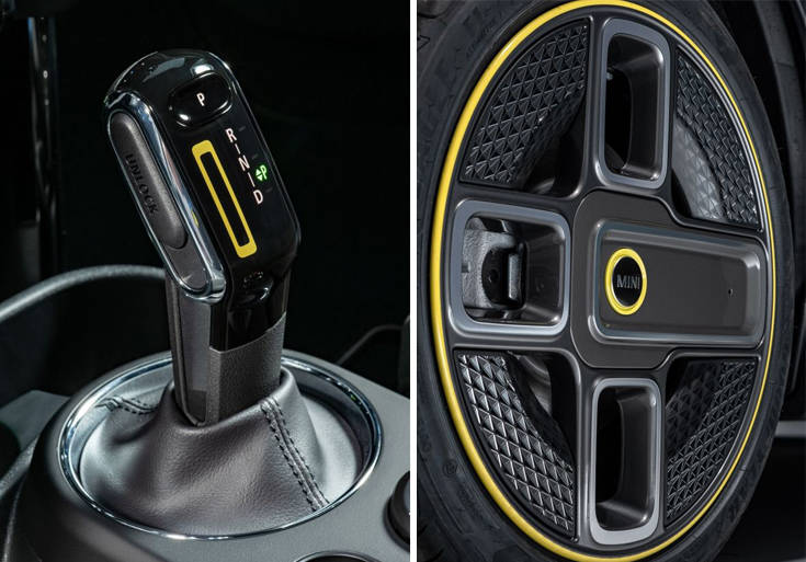 Ένα λογότυπο Mini Electric σηματοδοτεί τη διαφορά στη χρήση ενέργειας. Κίτρινες εκδόσεις αυτής της «ταυτότητας» εμφανίζονται στα πλαϊνά ένθετα των δεικτών πορείας, γνωστά ως φινιστρίνια, καθώς και στην πίσω πόρτα και την εμπρός μάσκα. Στο κέντρο του εμπρός τμήματος, συναντάμε τη διάσημη εξαγωνική μάσκα που όμως είναι κλειστή, καθώς ο ηλεκτροκινητήρας έχει ελάχιστες απαιτήσεις αέρα ψύξης. Μία κίτρινη διακοσμητική μπάρα στη μάσκα και τα καλύμματα των εξωτερικών καθρεπτών έχουν φινίρισμα ίδιου χρώματος, ολοκληρώνοντας τα σχεδιαστικά χαρακτηριστικά του μοντέλου, το οποίο εφοδιάζεται στάνταρ με προβολείς LED.