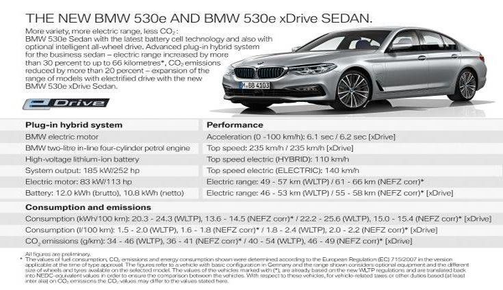 Παράλληλα με το λανσάρισμα της 530e Sedan, διατίθεται επίσης άμεσα η 530e xDrive Sedan (μικτή κατανάλωση καυσίμου 2.2 – 2.0 λτ/100 χλμ, κατανάλωση ηλεκτρικής ενέργειας: 15,4 – 15,0 kWh/100 χλμ, εκπομπές CO2 στο μικτό κύκλο: 49 – 46 γρ/χλμ), που συνδυάζει το προηγμένο, plug-in υβριδικό σύστημα με «έξυπνη» τετρακίνηση.