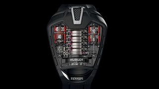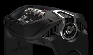 Ταυτόχρονα βέβαια- κι αυτό είναι το ιδιαίτερο χαρακτηριστικό- εξαιτίας του συστήματος κίνησης tourbillion, μοναδική πατέντα της Hublot, προσομοιάζει στη μορφή που έχει ένας κινητήρας της συγκεκριμένης Ferrari.