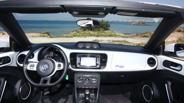 Το εσωτερικό του Beetle Cabrio είναι πανομοιότυπο με του κλειστού. Η σχεδίαση είναι ρετρό, τα πλαστικά είναι σκληρά, το φινίρισμα μέτριο για VW, ενώ τα χρώματα, το ντουλαπάκι και τα φωτιστικά εφέ ομορφαίνουν την ατμόσφαιρα.