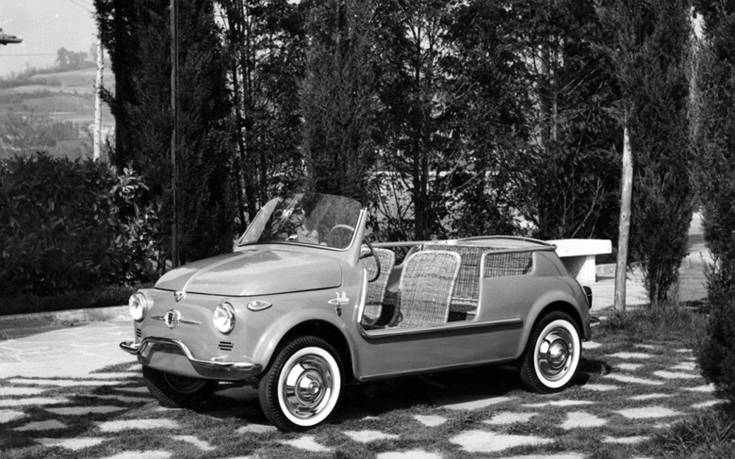 Εξαρχής το Fiat 500 του 1957 σχεδιάστηκε με ανοιγόμενη υφασμάτινη οροφή έτσι ώστε να κάνει οικονομία στο βάρος και την ποσότητα μετάλλου, αλλά παράλληλα και να προσφέρει σε όσο το δυνατόν περισσότερο κόσμο τη χαρά της οδήγησης ενός cabrio. Η έκδοση Jolly που έμεινε γνωστή με το παρατσούκλι “Spiaggina” πήγε ένα βήμα παραπέρα. Το κατασκευασμένο από την Carrozzeria Ghia Jolly επέτρεπε στους τέσσερις επιβαίνοντες να βρίσκονται σε απόλυτη επαφή με το τοπίο, ενώ η κατασκευασμένη από ψάθα επένδυση των καθισμάτων σήμαινε ότι μπορούσαν να ταξιδεύουν με βρεγμένα μαγιό χωρίς καμία τύψη. Με τιμή διπλάσια από εκείνη του απλού 500, το Jolly αγαπήθηκε από πλήθος γνωστών προσωπικοτήτων, όπως ο Αριστοτέλης Ωνάσης και ο Πρίγκιπας Ρενιέ του Μονακό.