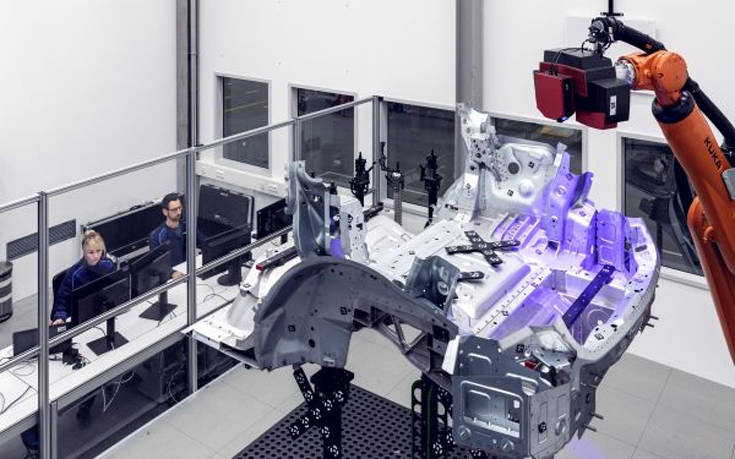 Η θερμότητα του ατσάλινου εξαρτήματος ενώνει τα δύο στοιχεία. Μετά τη συναρμολόγηση, τα αμαξώματα υποβάλλονται σε λεπτομερείς ελέγχους μέσω ραντάρ λέιζερ, μιας τεχνολογίας αυτοματοποιημένης μέτρησης που αναγνωρίζει άμεσα τα ατομικά χαρακτηριστικά των επιφανειών. Η λύση αυτή καταργεί την ανάγκη για μηχανική τοποθέτηση σημείων μετρήσεων, όπως ίσχυε μέχρι τώρα. Η νέα οπτική διαδικασία μειώνει επίσης δραστικά τον απαιτούμενο χρόνο για τις απαραίτητες μετρήσεις.