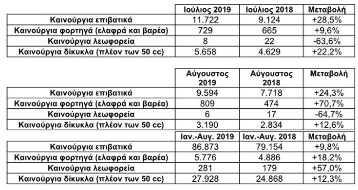 Συνολικά, στο 8μηνο Ιανουαρίου-Αυγούστου 2019, οι ταξινομήσεις καινούργιων επιβατικών είναι αυξημένες κατά +9,8% ως προς το αντίστοιχο διάστημα του 2018.