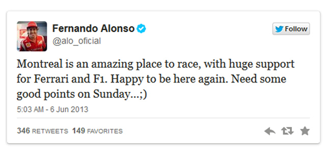 «Το Μόντρεαλ είναι ένα φανταστικό μέρος για να τρέξει κανείς, με μεγάλη υποστήριξη για τη Ferrari και τη Formula 1. Χαίρομαι που είμαι εδώ και πάλι. Θέλω κάποιους καλούς βαθμούς την Κυριακή», έγραψε στο Twitter ο Αλόνσο.