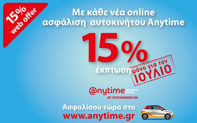 Η Anytime προσφέρει, μέχρι 31 Ιουλίου, web offer έκπτωση 15% σε κάθε νέα online ασφάλιση αυτοκινήτου.