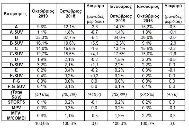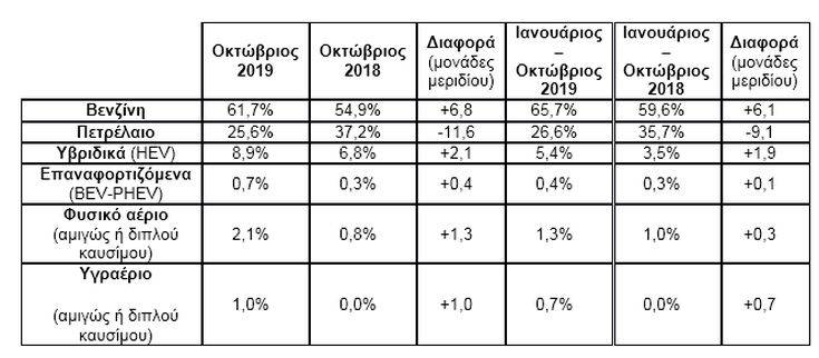 Επίσης, σύμφωνα με πρώτους υπολογισμούς, η πρόοδος στις διάφορες κατηγορίες επιβατικών και στην κατανομή ανά καύσιμο, ως τον Οκτώβριο, έχει ως εξής: