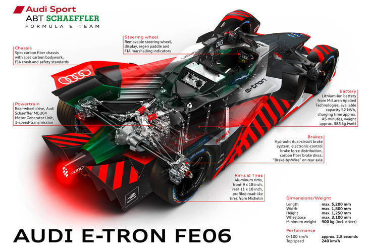 Η Audi συμμετέχει στην εφετινή σεζόν με το μονοθέσιο με κωδικό e-tron FE06. Στην εξέλιξη του νέου μονοθέσιου η εταιρία βελτιστοποίησε κάθε λεπτομέρεια περνώντας ατέλειωτες ώρες σε φάση προσομοίωσης. Τα αποτελέσματα, ακόμα μεγαλύτερη απόδοση, μικρότερο βάρος, καλύτερη εκμετάλλευση του χώρου και αυξημένες δυνατότητες του λογισμικού.