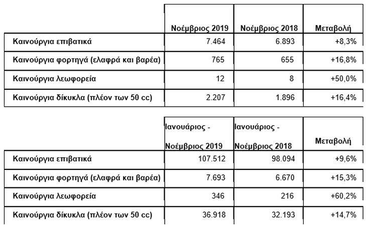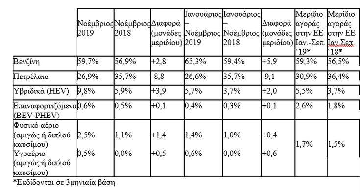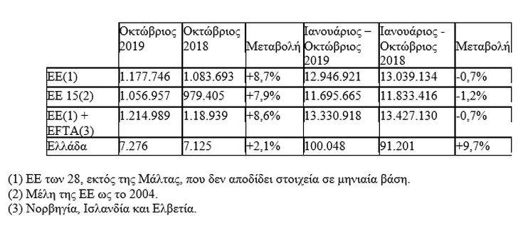 Τέλος, σε επίπεδο ΕΕ, με βάση τα στοιχεία του Ευρωπαϊκού Συνδέσμου Κατασκευαστών Αυτοκινήτων (www.acea.be), η αγορά των επιβατικών ήταν αυξημένη μεσοσταθμικά περίπου 8,5% έως και τον Οκτώβριο, αλλά στο σύνολο του 10μήνου, υστερούσε περίπου 1% από το 2018, με τους ακριβείς αριθμούς να έχουν ως εξής: