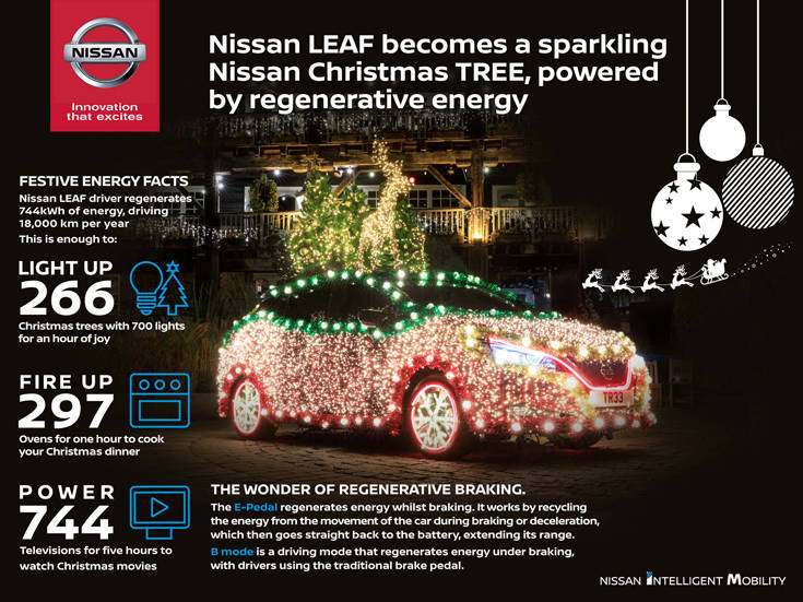 Προκειμένου να γιορτάσει το πνεύμα των Χριστουγέννων, αλλά και την ανάκτηση ενέργειας, η Nissan μετέτρεψε με ειδική κατασκευή ένα μοναδικό Leaf σε Χριστουγεννιάτικο δέντρο. Προσφέροντας ένα εκπληκτικό φωτεινό θέαμα, το συγκεκριμένο όχημα που για την περίσταση ονομάστηκε «Nissan TREE», παρουσιάζει τον τρόπο με τον οποίο το ηλεκτρικό αυτοκίνητο ανακτά ενέργεια κατά την πέδηση ή την επιβράδυνση.