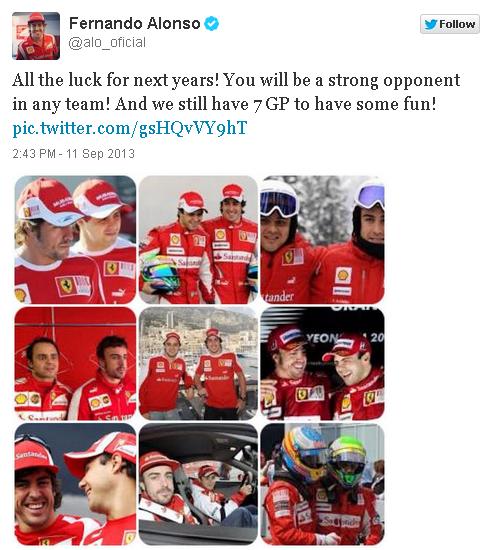 Μέσω twitter ήρθε η ανακοίνωση αποχώρησης του Φελίπε Μάσα από τη Ferrari. Το ίδιο Μέσο χρησιμοποίησε και ο Φερνάντο Αλόνσο για να στείλει τις ευχές του στον Βραζιλιάνο πιλότο με τον οποίο μοιράζονταν το ίδιο γκαράζ για τρία χρόνια.
