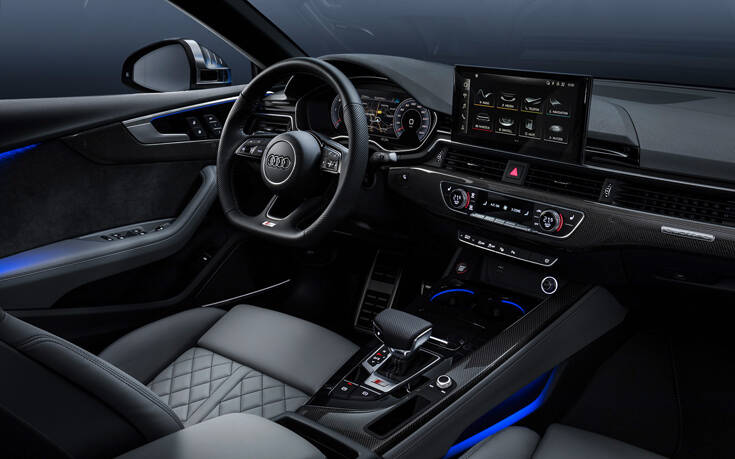 Οι οριζόντιες γραμμές κυριαρχούν στο εσωτερικό. Το κέντρο ελέγχου του νέου λειτουργικού συστήματος είναι η μεγάλη οθόνη αφής MMI, το σημείο εστίασης του ταμπλό που έχει ελαφρά κλίση προς τον οδηγό. Το πολύχρωμο πακέτο φωτισμού περιγράμματος/περιβάλλοντος προσθέτει φωτεινές ενδείξεις στο σκοτάδι και είναι στάνταρ με την επιλογή εσωτερικού Design.