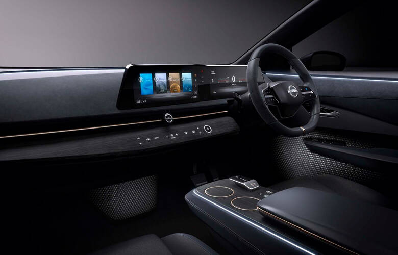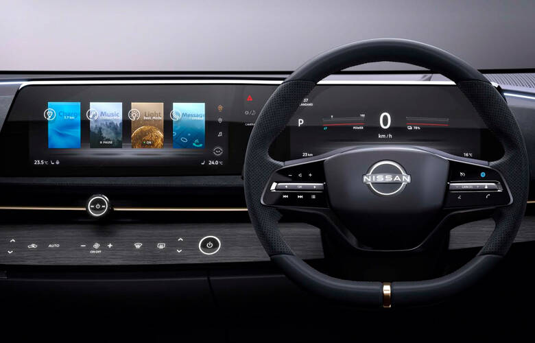 Η Nissan επέλεξε μια διαφορετική πορεία κατά την ανάπτυξη της οθόνης του Ariya Concept, δίνοντας προτεραιότητα στον σχεδιασμό, οραματιζόμενη τις τελευταίες τάσεις. Αντί ενός tablet, το ηλεκτρικό crossover έχει μια καμπυλοειδή διπλή οθόνη που θυμίζει κύμα. Προφέρει την αίσθηση του «ορίζοντα» σε όλο το αυτοκίνητο, σε συνδυασμό με το διάκοσμο από τις πόρτες, μέχρι το πίσω μέρος της καμπίνας. Η διάταξη αντικατοπτρίζει την νέα σχεδιαστική γλώσσα του «Διαχρονικού Ιαπωνικού Φουτουρισμού» της μάρκας, που εκφράζεται επίσης και από την εμπρός μάσκα – «ασπίδα» του πρωτότυπου.