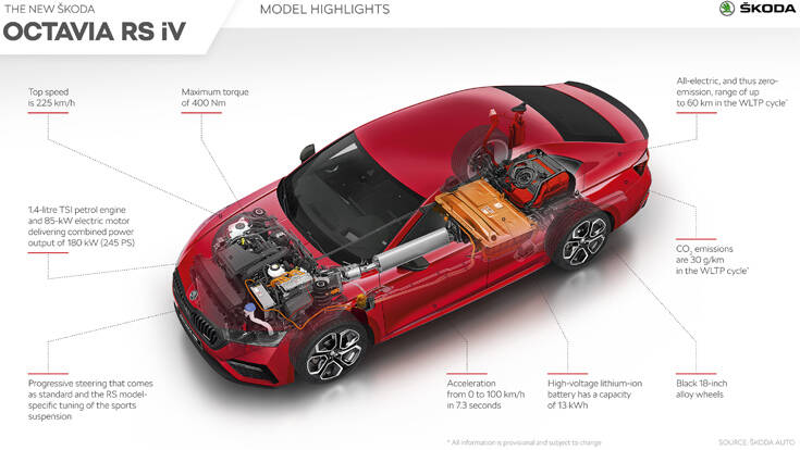 Η μπαταρία ιόντων λιθίου υψηλής τάσης έχει χωρητικότητα 37 Ah, προσφέροντας στο αυτοκίνητο ενέργεια 13 kWh, που εξασφαλίζει αυτονομία μέχρι 60 χλμ. στον κύκλο WLTP. Επειδή η ροπή 330 Nm που παρέχεται από τον ηλεκτροκινητήρα διατίθεται από μηδενικές στροφές, η Octavia RS iV μπορεί να επιταχύνει πολύ γρήγορα. Στη λειτουργία Sport, η οποία επιτρέπει στον οδηγό να αξιοποιήσει την πλήρη ισχύ του αυτοκινήτου, το μεγάλο αμάξωμα επιταχύνει 0-100 χλμ./ώρα σε μόλις 7,3 δευτερόλεπτα, ενώ η μέγιστη ταχύτητά φθάνει τα 225 χλμ./ώρα.