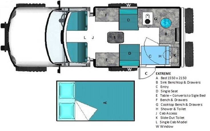 Μια δεξαμενή νερού 80 λίτρων τροφοδοτεί την πλήρως εξοπλισμένη κουζίνα, την ίδια ώρα που όλα τα άλλα ανοιγοκλείνουν, εξοικονομώντας πολύτιμο χώρο.