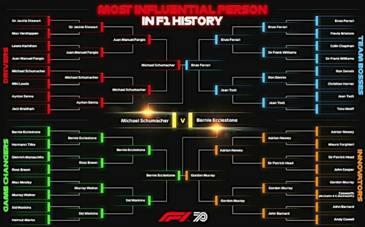 Η Formula 1 πραγματοποίησε στην ιστοσελίδα της με αφορμή την 70ή της επέτειο ένα πρωτότυπο γκάλοπ. Το ερώτημα ήταν ποιον θεωρούν οι οπαδοί ως τον άνθρωπο που έχει επηρεάσει περισσότερο από οποιονδήποτε άλλον το άθλημα στην ιστορία του, η οποία ξεκίνησε με το πρώτο Γκραν Πρι στις 13 Μαΐου του 1950 στο Σίλβερστον της Μεγάλης Βρετανίας.