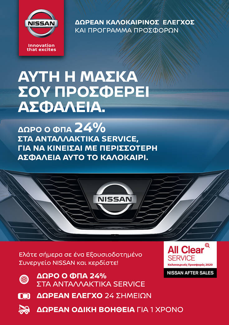 Με κεντρικό σύνθημα «Αυτή η μάσκα σου προσφέρει ασφάλεια», η Nissan προτάσσει την αξιοπιστία της, υπογραμμίζοντας τους δεσμούς της με όλους τους κατόχους μοντέλων της, μέσω του καλοκαιρινού προγράμματος All Clear Service.