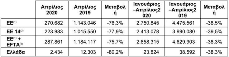 Επίσης, σε επίπεδο ΕΕ, με βάση τα στοιχεία του Ευρωπαϊκού Συνδέσμου Κατασκευαστών Αυτοκινήτων (www.acea.be), η αγορά των επιβατικών παρουσίασε εντυπωσιακή πτώση και κινήθηκε ως και τον Απρίλιο (στο ζενίθ των περιορισμών) ως εξής: