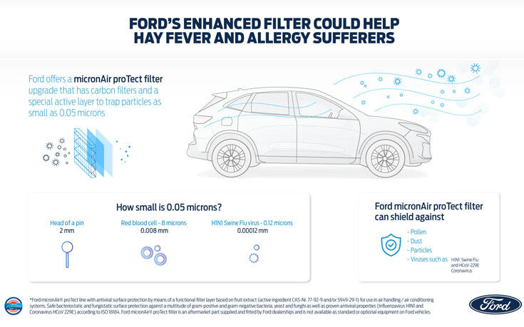Η Ford προσφέρει τώρα στα οχήματά της ένα αναβαθμισμένο φίλτρο, το οποίο μπορεί να ανακουφίζει σημαντικά όσους πάσχουν από αλλεργική ρινίτιδα και εποχικές αλλεργίες. Το φίλτρο micronAir proTect, προϊόν εξέλιξης της Freudenberg, μιας εταιρείας που ειδικεύεται στα συστήματα του είδους, είναι πολύ αποτελεσματικό στη συγκράτηση ποικίλων βλαβερών μικροβίων, αλλεργιογόνων ουσιών, ακόμα και ιών που ενδέχεται να προκαλέσουν σοβαρά προβλήματα υγείας.