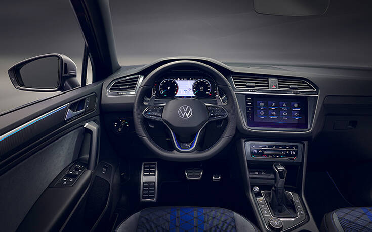 Το Tiguan R των 320 ίππων, εξωτερικά ξεχωρίζει από τους προφυλακτήρες, τον πίσω διαχύτη, τους μεγαλύτερους θόλους τροχών και τις ζάντες αλουμινίου «Estoril» 21 ιντσών. Το εσωτερικό του διαθέτει σπορ καθίσματα που εξελίχθηκαν αποκλειστικά για αυτό το μοντέλο με ενσωματωμένα στηρίγματα κεφαλής που ανταποκρίνονται στη δυναμική φύση του οχήματος, τόσο οπτικά όσο και εργονομικά. Άλλα χαρακτηριστικά περιλαμβάνουν Digital Cockpit που φέρει το λογότυπο R και ενσωματωμένο χρονομετρητή γύρου, διακοσμητικό φινίρισμα R (Carbon Grey) και φωτιστικά διακοσμητικά πάνελ. Το εσωτερικό ολοκληρώνει ένα νέο σπορ τιμόνι R με κουμπί R για άμεση ενεργοποίηση της λειτουργίας Race και σπορ paddles για χειροκίνητο έλεγχο του αυτόματου κιβωτίου ταχυτήτων διπλού συμπλέκτη 7 σχέσεων (DSG), το οποίο είναι επίσης στάνταρ εξοπλισμός.