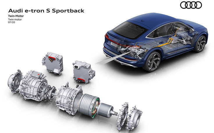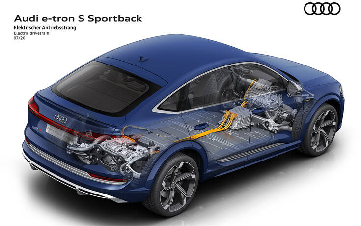 Τα νέα μοντέλα S έχουν δύο ηλεκτρικούς κινητήρες στον πίσω άξονα και έναν στον μπροστινό, όντας τα πρώτα ηλεκτρικά αυτοκίνητα μαζικής παραγωγής στον κόσμο με τρεις ηλεκτρικούς κινητήρες. Οι μηχανικοί πήραν τον ηλεκτροκινητήρα του e-tron 55, που στο μοντέλο αυτό κινεί τον μπροστινό άξονα, αύξησαν την ισχύ του και τον τοποθέτησαν εις διπλούν, φυσικά με μεμονωμένες τροποποιήσεις, στον πίσω άξονα των εκδόσεων S.