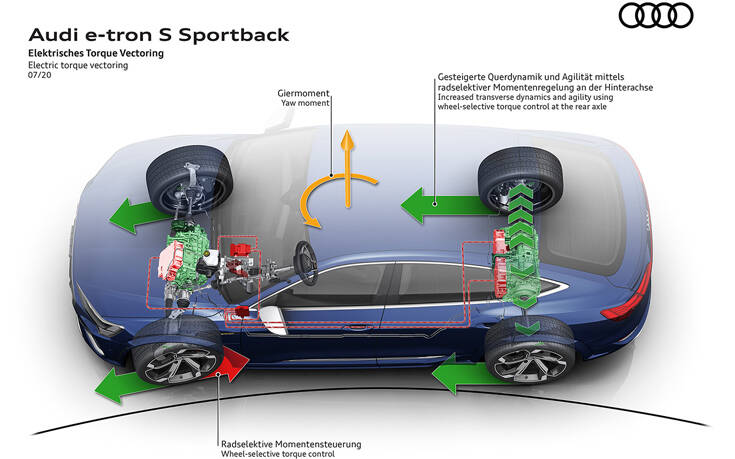 Η ηλεκτρική κίνηση σε όλους τους τροχούς πλέον ενισχύεται και με έλεγχο κατανομής της ροπής (electric torque vectoring). Κάθε ένας από τους πίσω ηλεκτροκινητήρες στέλνει την κινητήρια ροπή του στον αντίστοιχο τροχό μέσω απευθείας μετάδοσης, δεν υπάρχει πλέον μηχανικό διαφορικό. Η όλη διαδικασία πραγματοποιείται ακαριαία σύμφωνα με τις απαιτήσεις της κίνησης, σε χιλιοστά του δευτερολέπτου και το σύστημα είναι σε θέση να διαχειριστεί πολύ υψηλά επίπεδα ροπής.